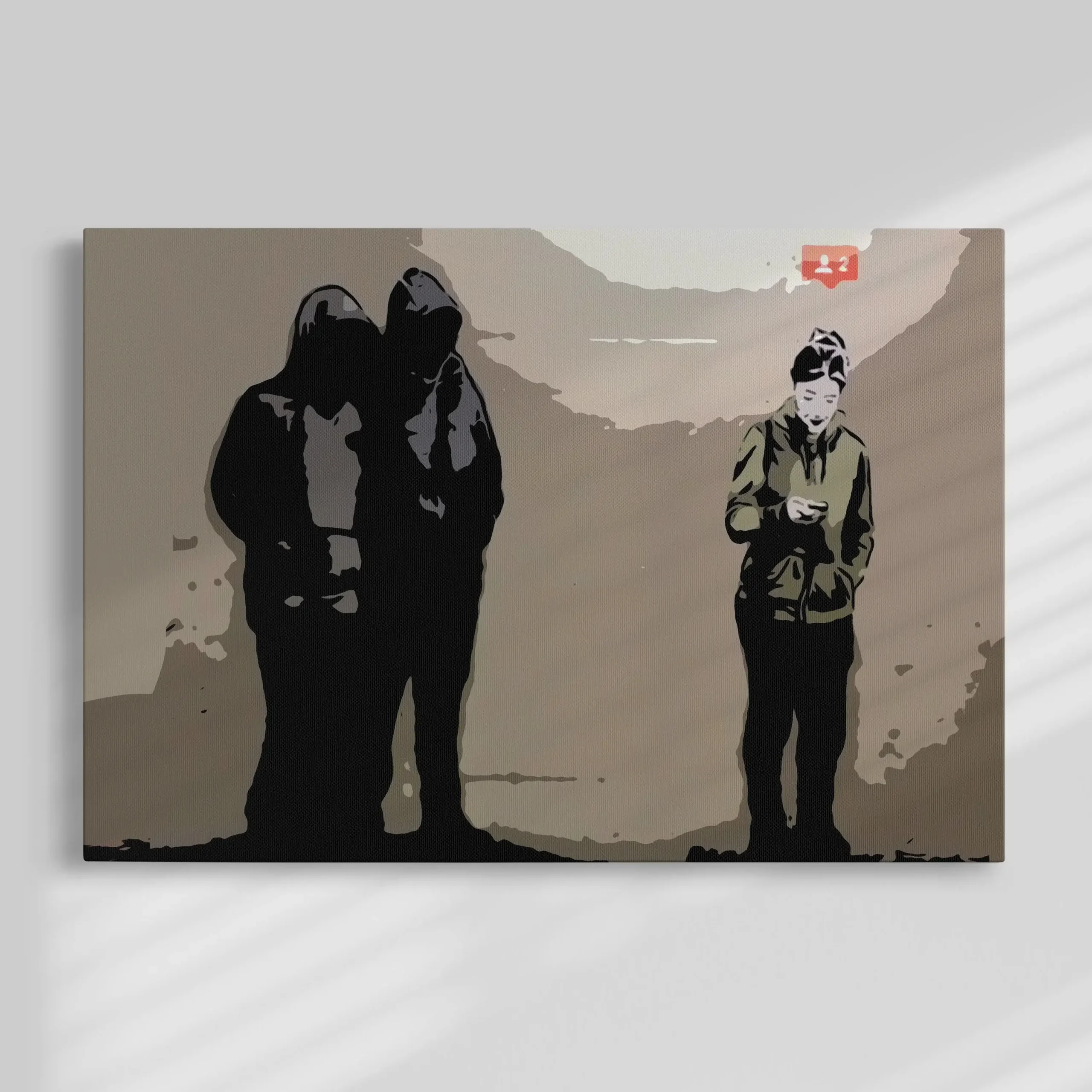 Banksy Followers from our street art collection is a Banksy influenced hand painted oil painting on canvas. This painting is only available at Blue Surf Art, designed and painted by an experienced and skilled artist in our in-house studio.